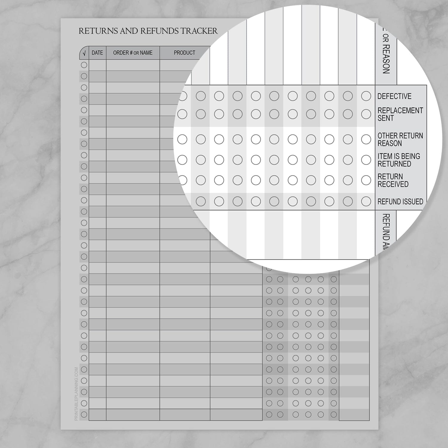 Designed for binder use or stand-alone organization, the page includes clearly labeled sections for logging important details and a column of circles you can fill in as you complete each stage of the return or refund process. The clean design helps keep things pleasantly presented while giving you a professional way to keep your records organized.